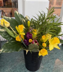 Yes, I do flower arranging too. Here’s a simple hand-tied posy which works well with those hollow-stemmed tulips and daffodils. Just a bit of greenery and some tape to hold the lot together. Simple!